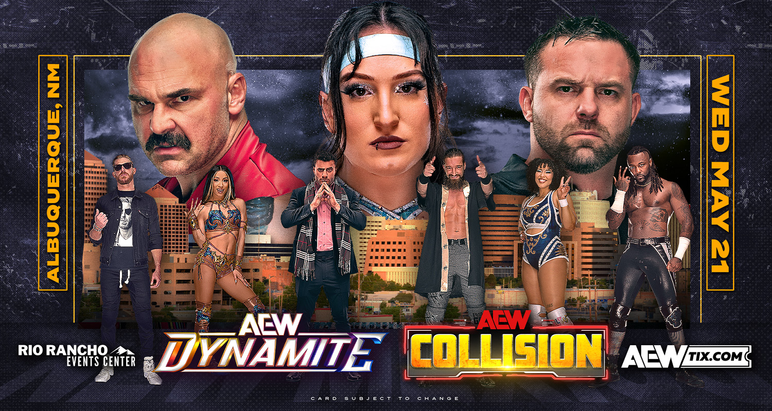 ALBUQUERQUE! All Elite Wrestling makes its debut with an epic double-down night of professional wrestling as AEW Dynamite AND AEW Collision invade the Rio Rancho Events Center on May 21st!