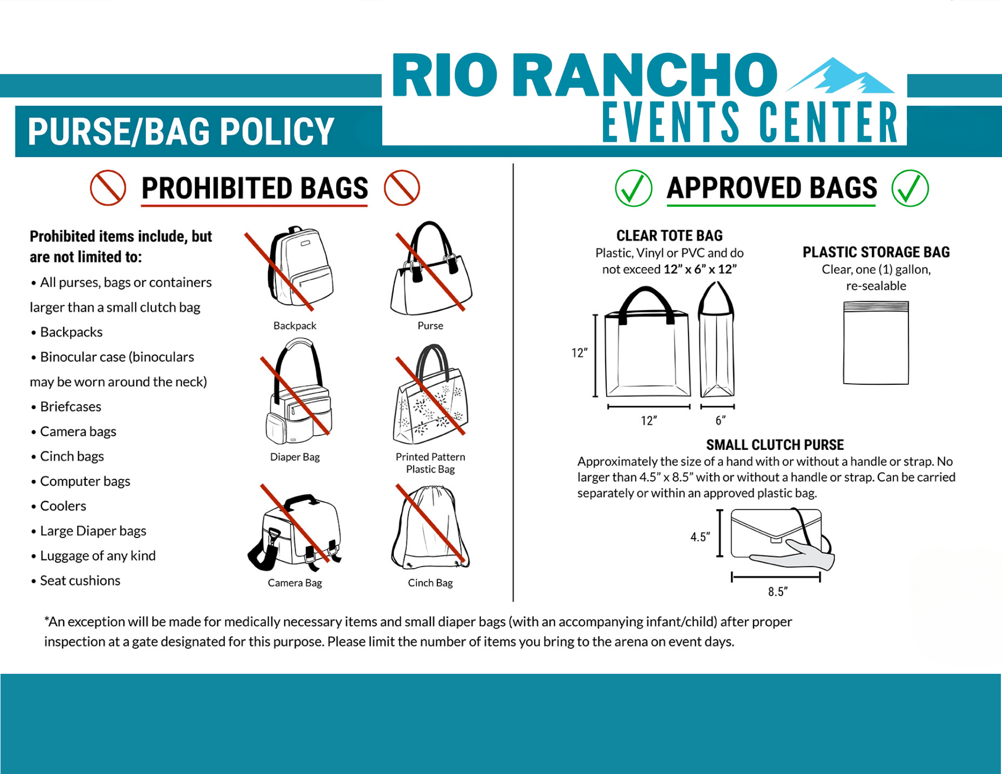 The Rio Rancho Events Center enforces a “no re-entry” policy. If a guest enters the building and has their ticket scanned, they cannot re-enter using the same ticket. For emergency situations, please contact a Security or Guest Services member.